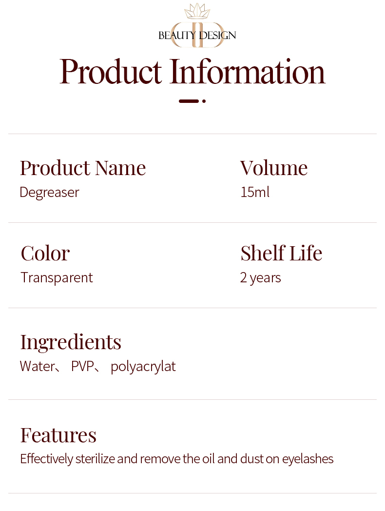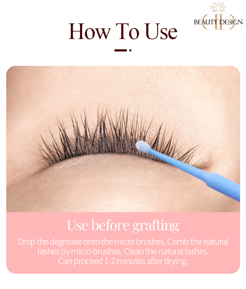 Degresantul este destinat dizolvării adezivului folosit în cadrul procedurii anterioare de aplicare a extensiilor de gene a căror îndepărtare se dorește în cadrul procedurii curente. Soluția se aplică prin intermediul periei cu microfibră pe suprafața cu adeziv a genelor, moment de la care începe să acționeze pentru dizolvarea acestuia într-un termen de așteptare de circa 2 minute.
